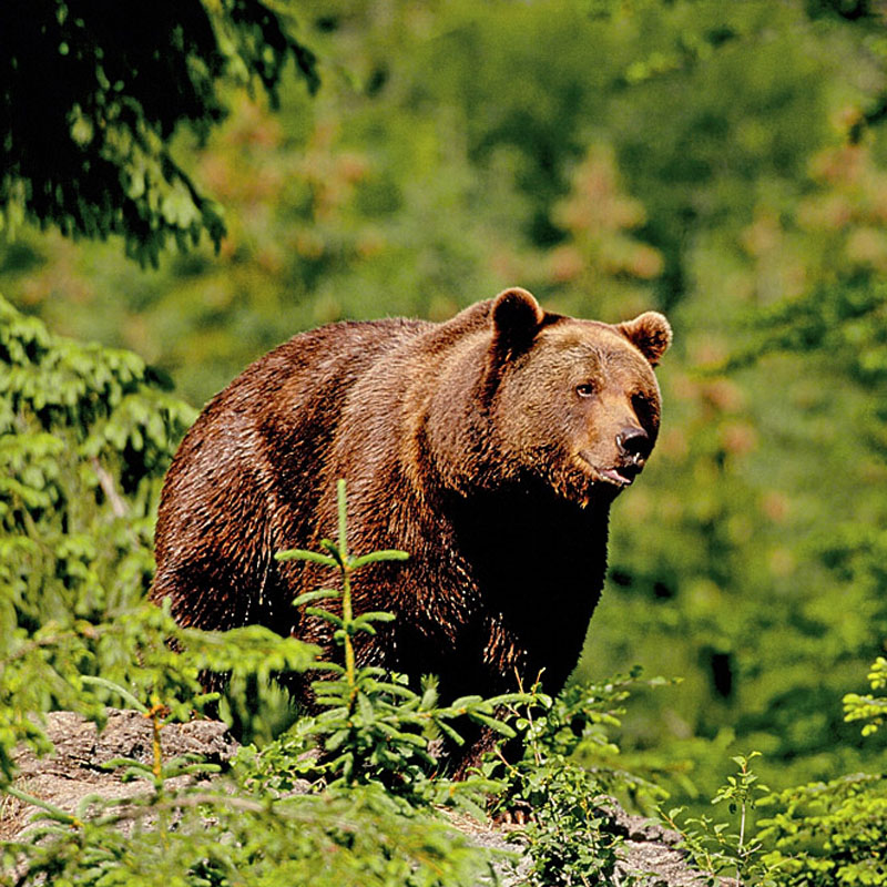 Bären sind bekannt für ihr Brummen. Der Braunbär ist in den Hochgebirgen sehr selten geworden. Wenige davon bewohnen heute die letzten großen Wälder Europas, Asiens und Nordamerikas. Die meiste Zeit des Jahres lebt der Bär als Einzelgänger im Gebirge. Wie die Braunfärbung ist auch die Ernährung dieser Allesfresser in verschiedenen Gegenden unterschiedlich. Wir finden gebietsweise reine Vegetarier, es gibt aber auch Bären, die sich ausschließlich von der Jagd auf größere Wild- und Haustiere ernähren. Die ,,kuscheligen" Riesen sind sehr scheu, der Mensch zählt zur ihrem natürlichen Feind.