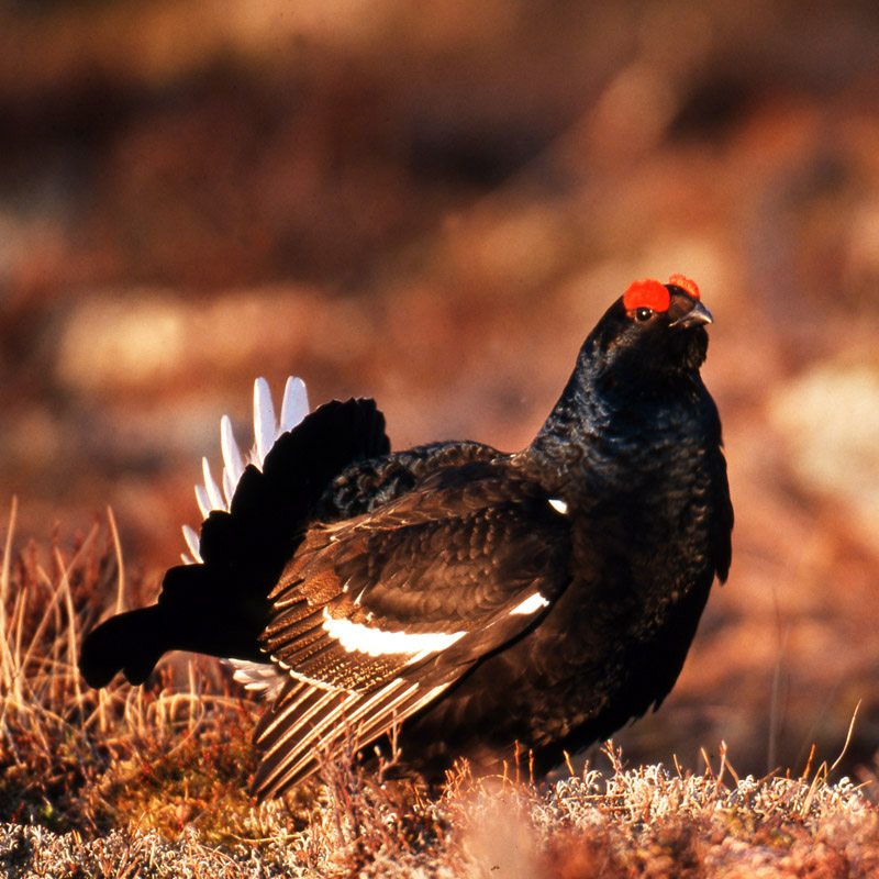 Birkhähne blasen, zischen, kullern und gurgeln bei der Balz, um die Aufmerksamkeit ihrer Hennen zu erreichen. Das männliche Birkhuhn ist einer der schönsten und buntesten heimischen Vögel und gehört zur Gattung der Raufußhühner. Zu erkennen ist der Birkhahn an den zwei am Kopf sitzenden, charakteristischen roten Verdickungen, den so genannten ,,Rosen". Birkhühner sind etwas größer als ein Haushuhn - der Birkhahn wird rund 50 cm groß, die Birkhenne nur etwa 40 cm. Birkhühner sind selten und leben bevorzugt in Moor- und Heidegebieten sowie im Gebirge an der Baumgrenze.