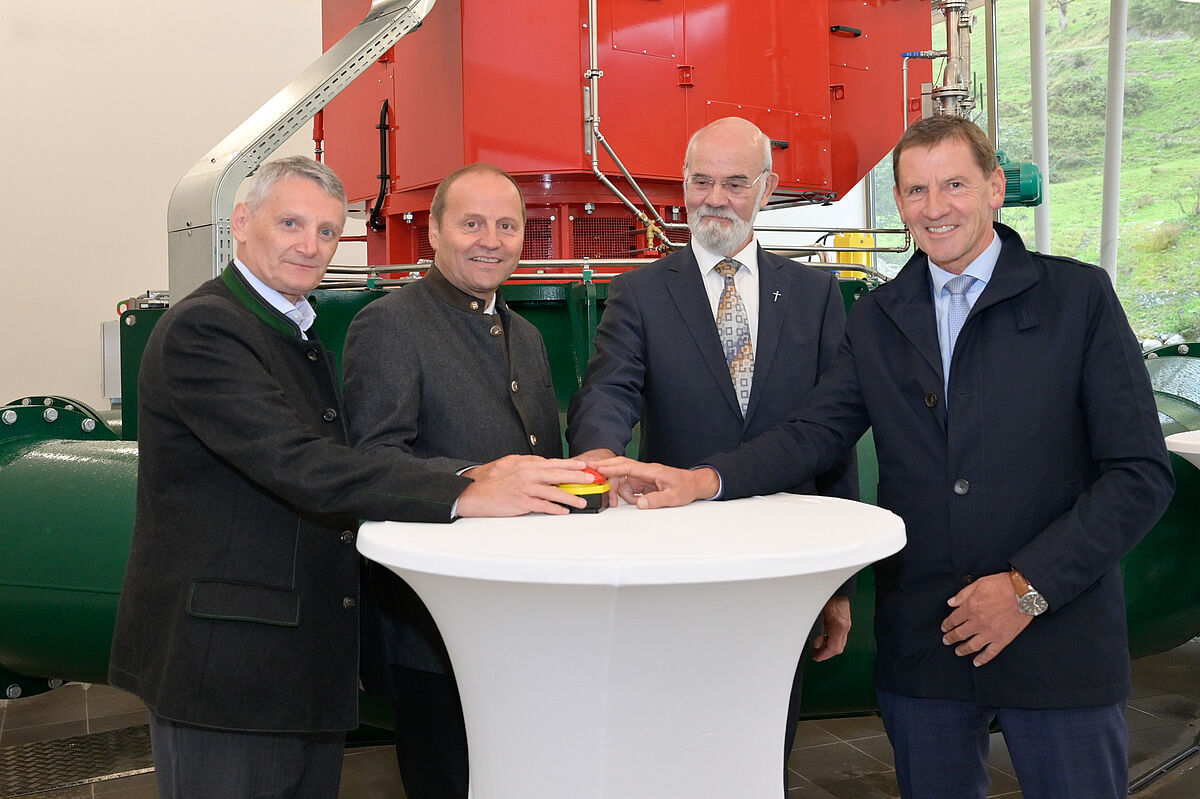 Eröffnung Kleinwasserkraftwerk Langer Grund Ache, v.l.n.r. ÖBf-Vorstand Georg Schöppl, LHStv. Josef Geisler, Ortspfarrer Sebastian Kitzbichler, Bgm. Paul Sieberer