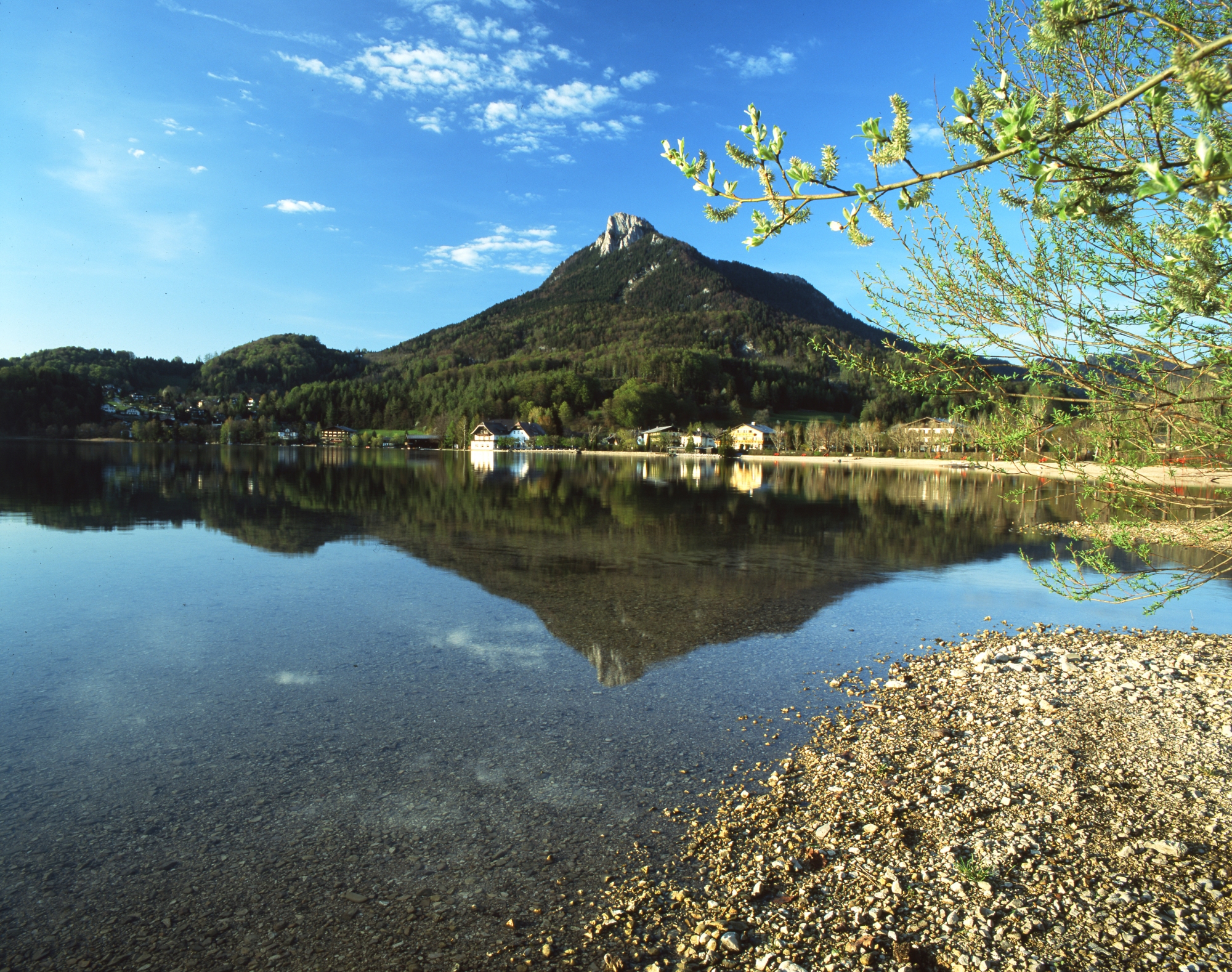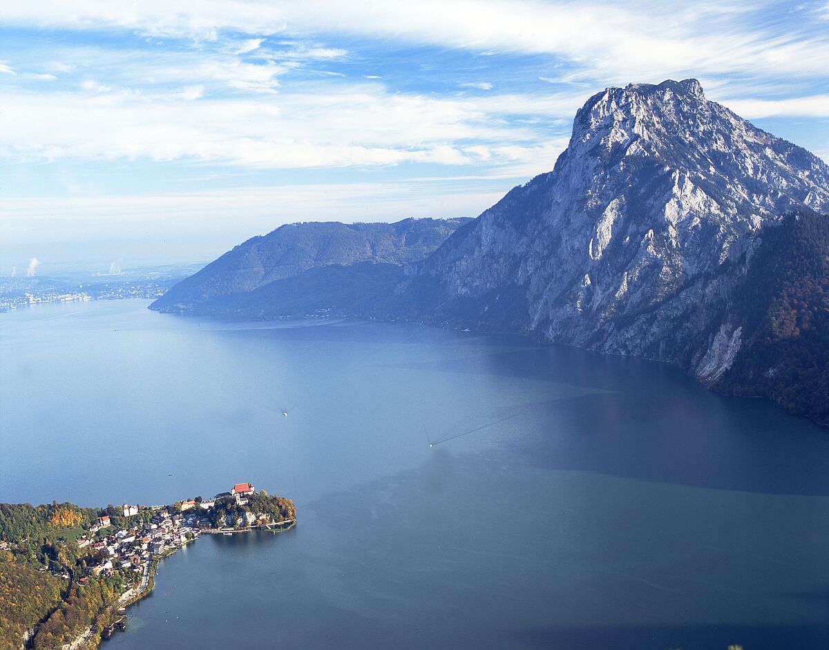 Blick von Süden auf den Traunsee mit Traunkirchen und Traunstein (OÖ)