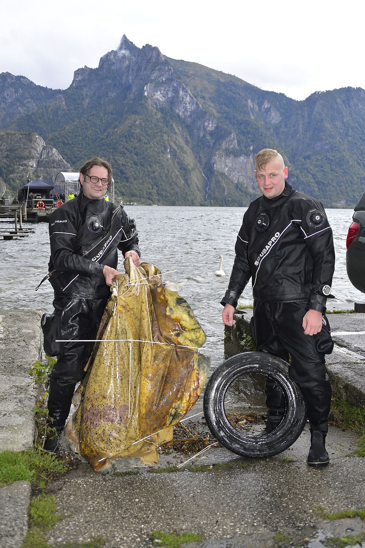 Autoreifen und Sonnenschirme werden aus dem Traunsee geborgen (OÖ, 20.9.2022)