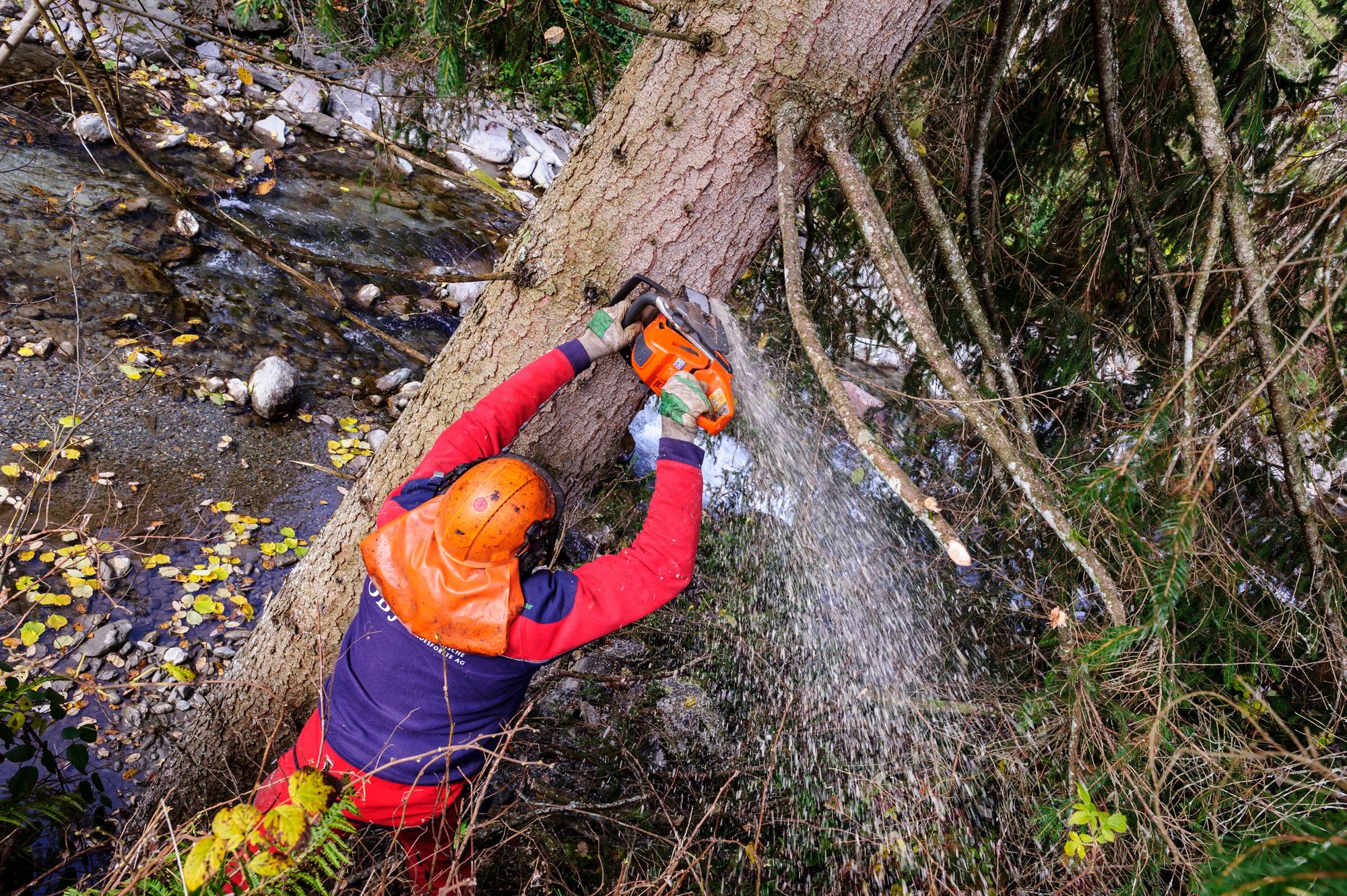Präzisionsarbeit - Baum muss über Bachbett gehoben werden