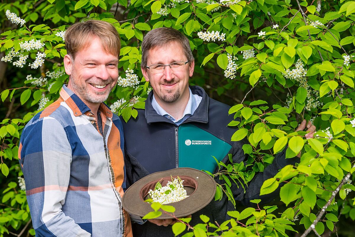Braumeister Alex Kiesbye (li.) mit Bundesforste-Revierleiter Harald Zollner bei der Ernte der Kirschblüten