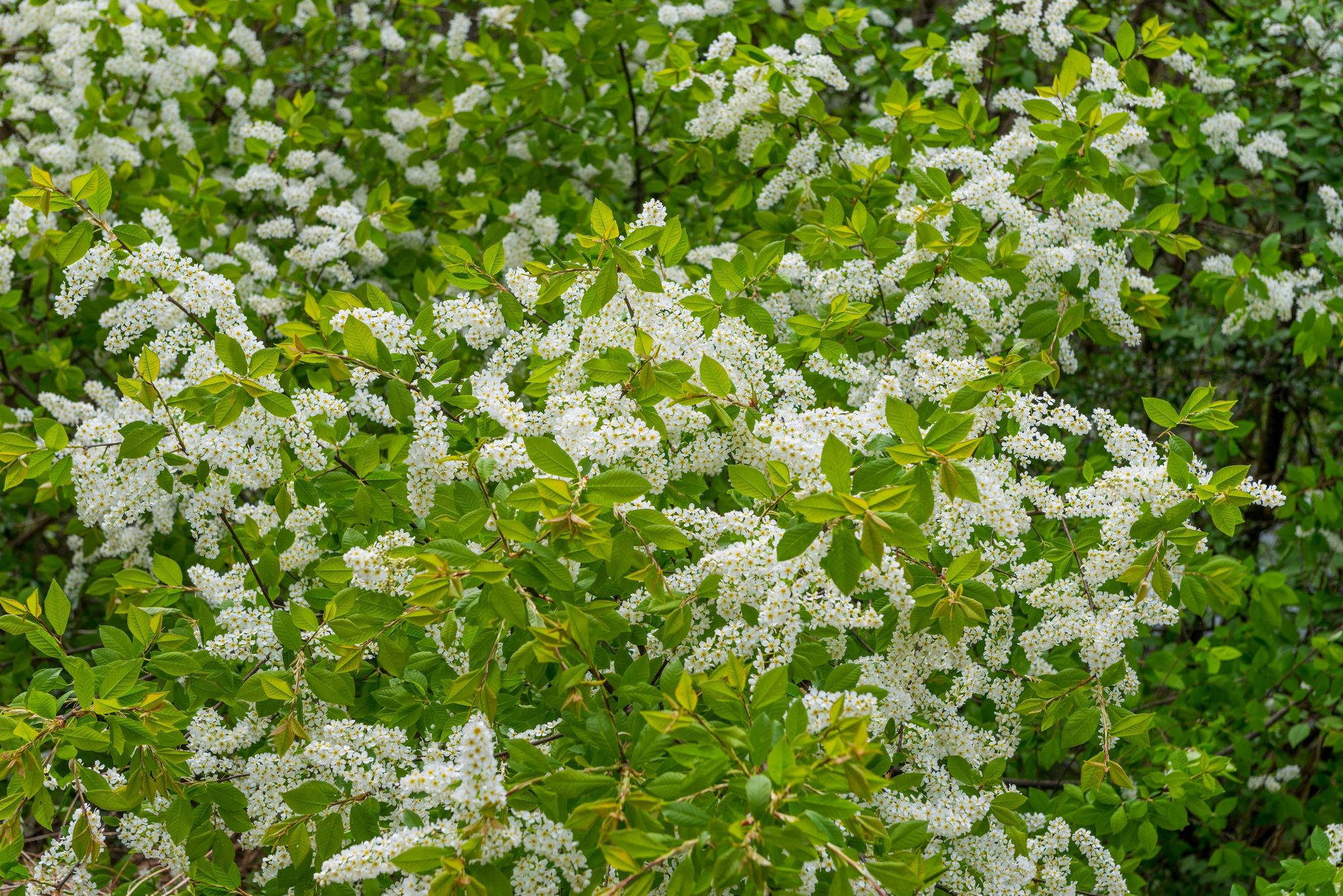 Frisch geerntete Blüten der Traubenkirsche (prunus padus)