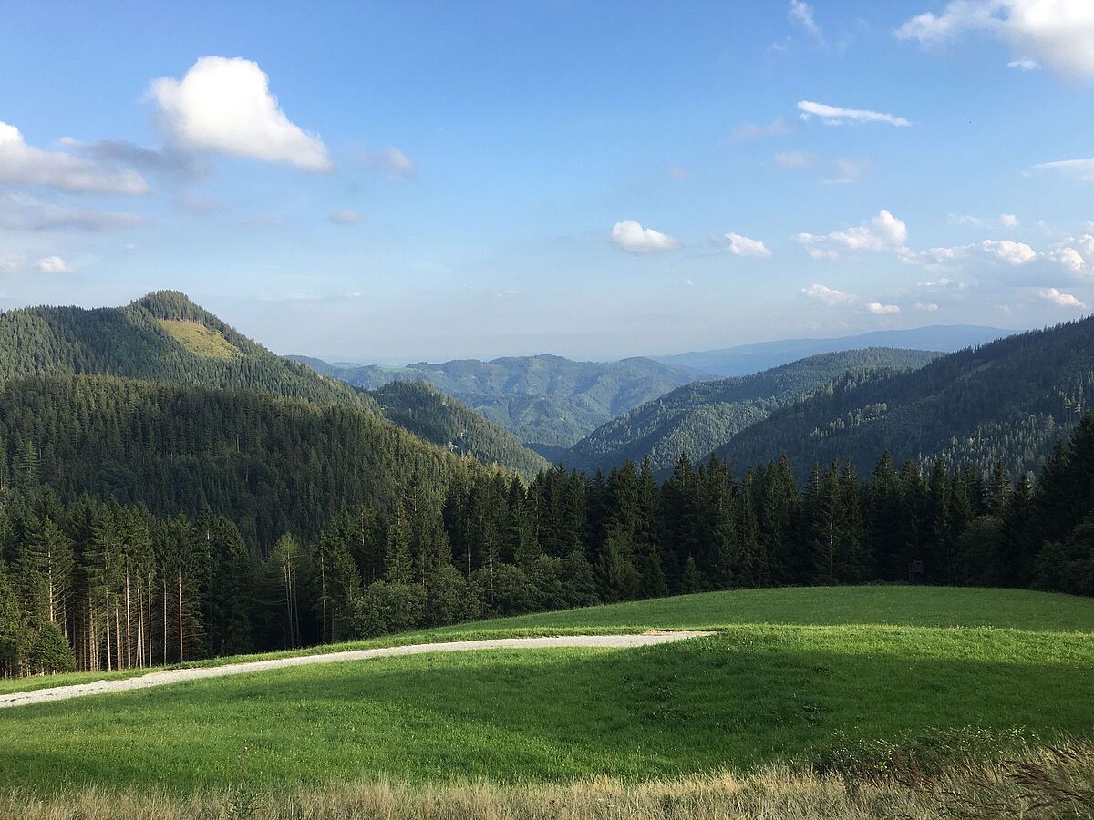 Ausblick von der Hütte auf die Wälder der Umgebung, Weststeiermark
