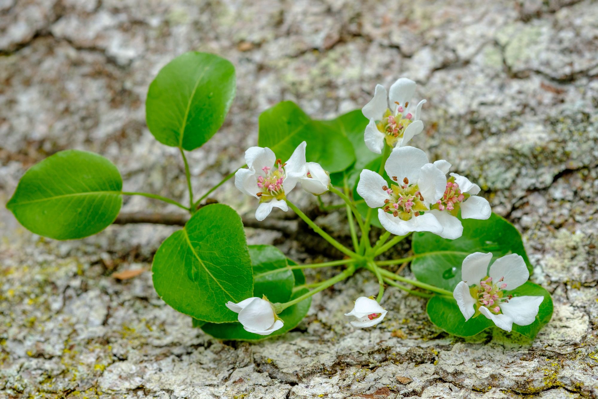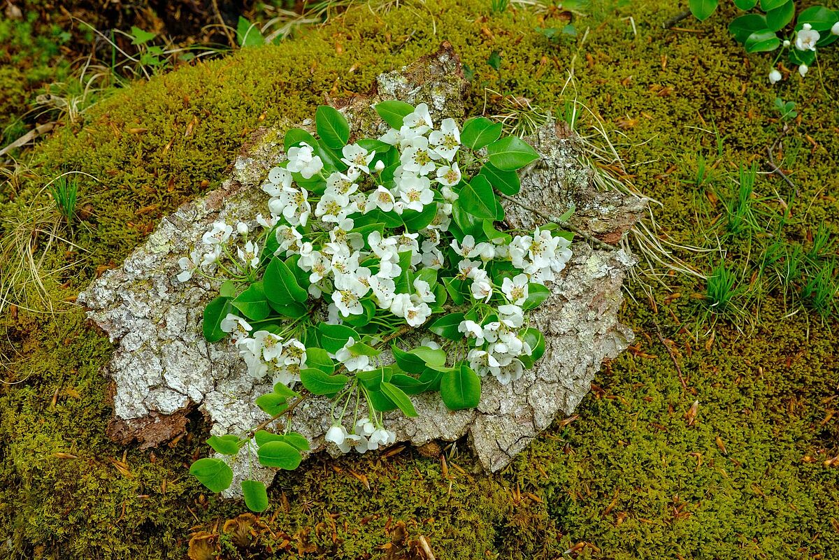 Blüten und Blätter von der Holzbirne auf Borkenteller