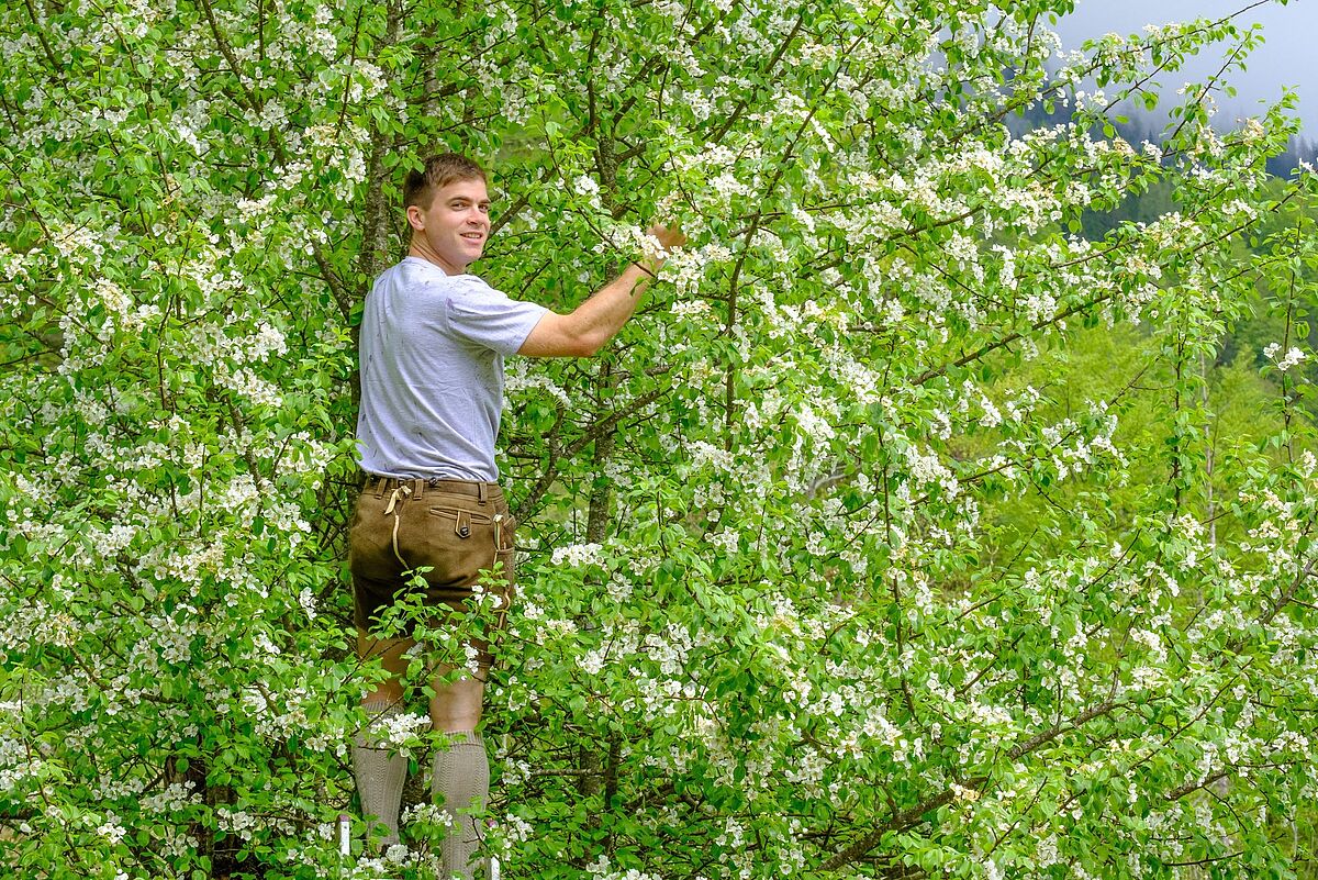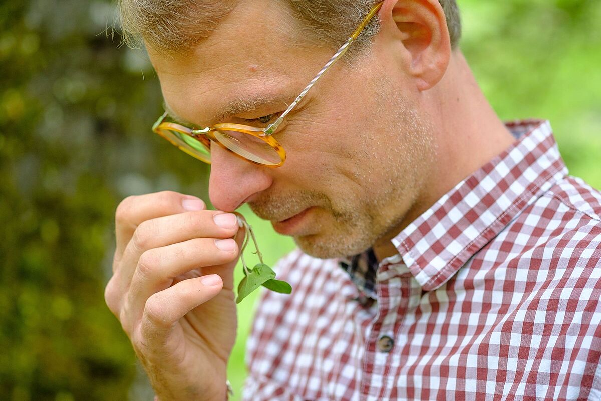Braumeister Axel Kiesbye überzeugt sich vom Duft der Blüten der Holzbirne (Pyrus pyraster)