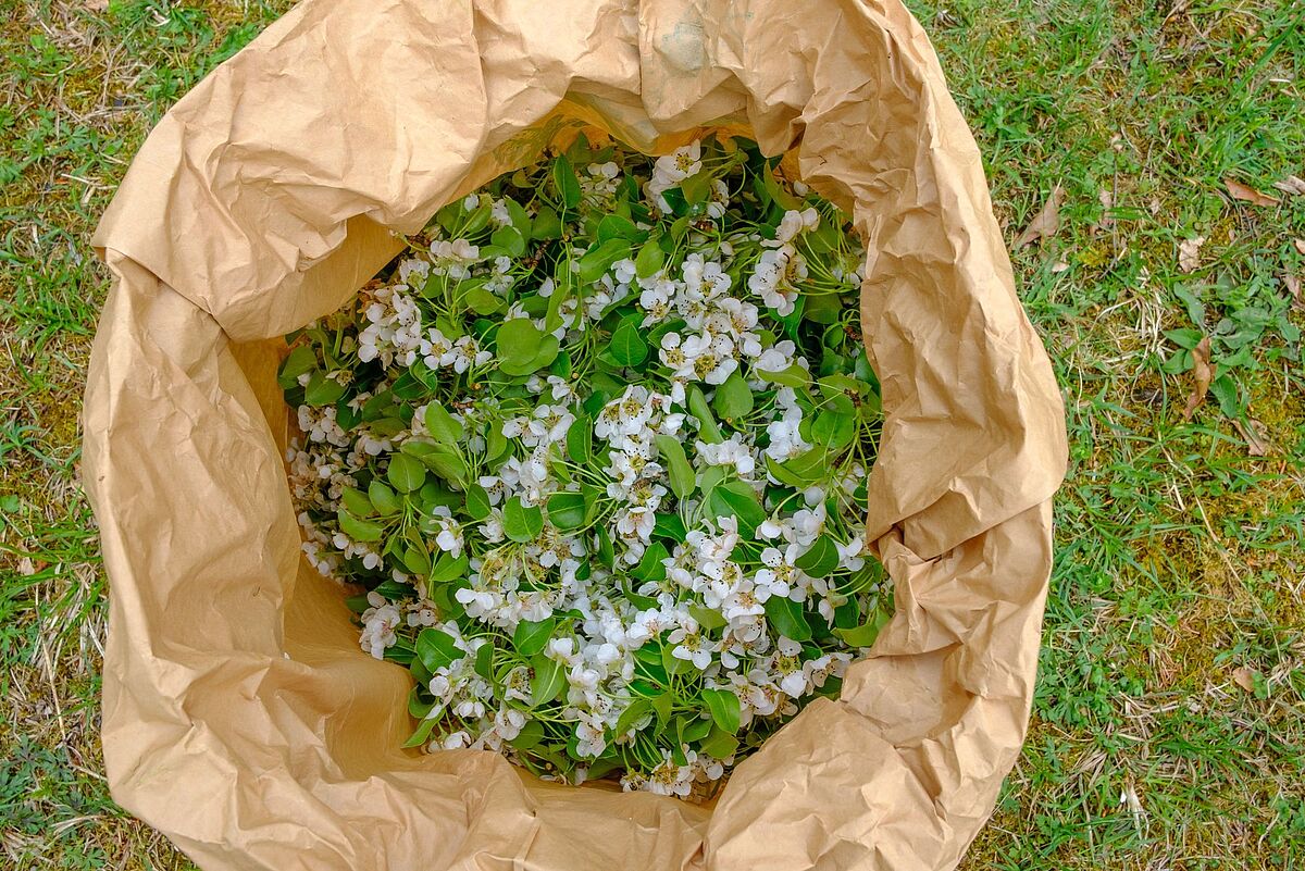 Geerntete Blüten und Blätter der Holzbirne (Pyrus pyraster)