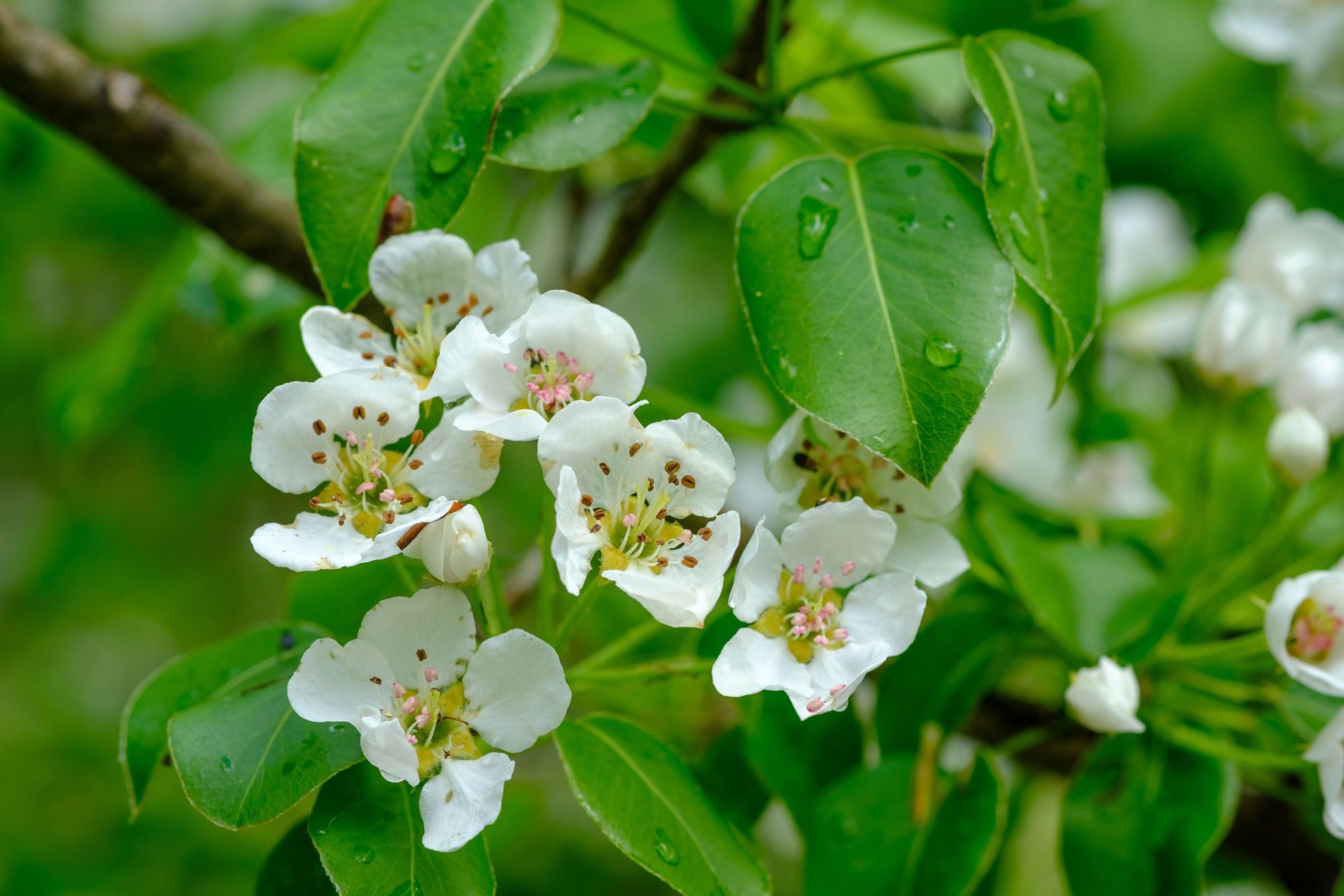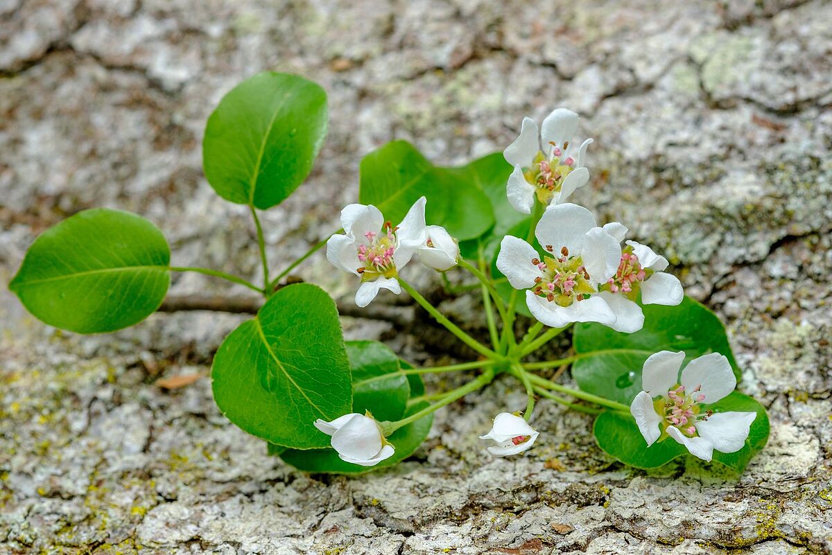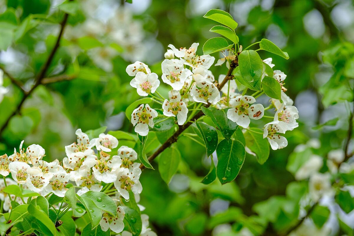 Blüten und Blätter der Holzbirne (Pyrus pyraster)