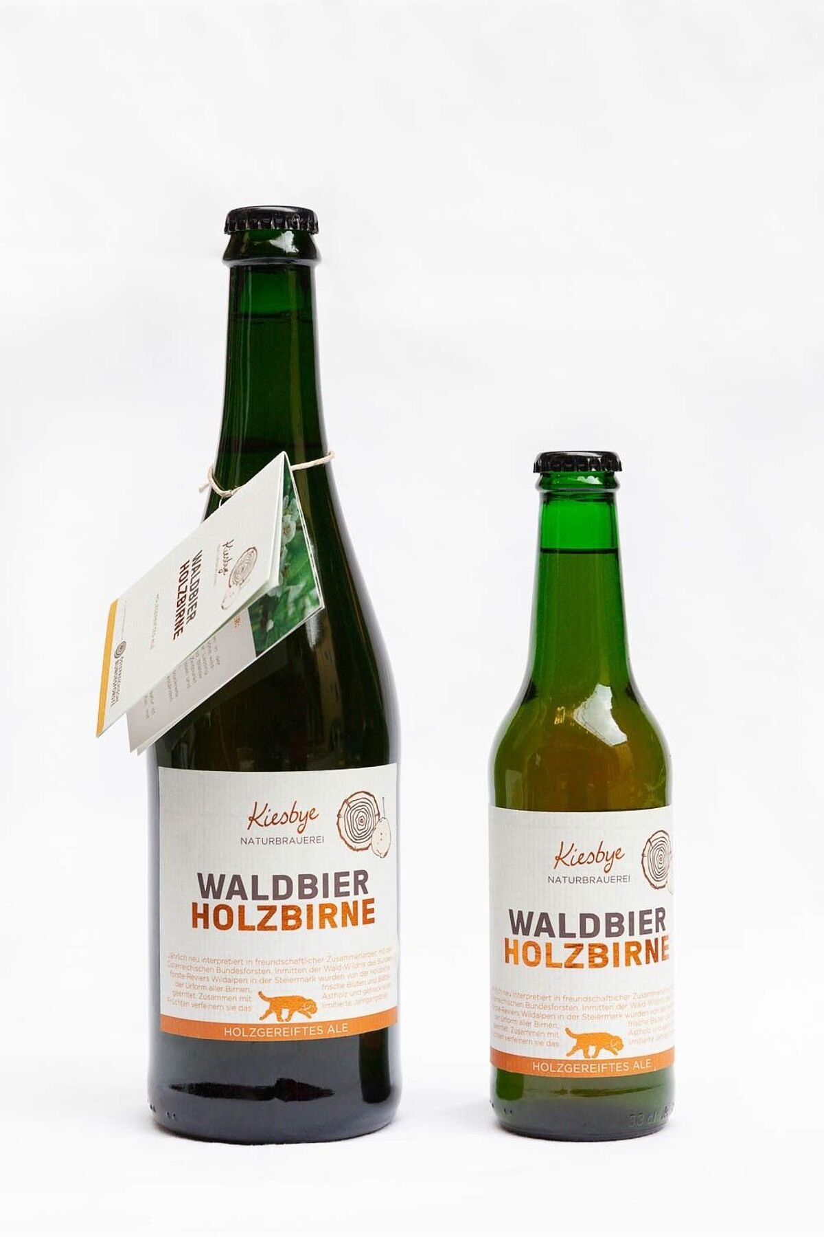 Waldbier Jahrgang 2018 "Holzbirne" in der Gourmetflasche zu 0,75l (li.) und in der Degustierflasche zu 0,33l (re.)