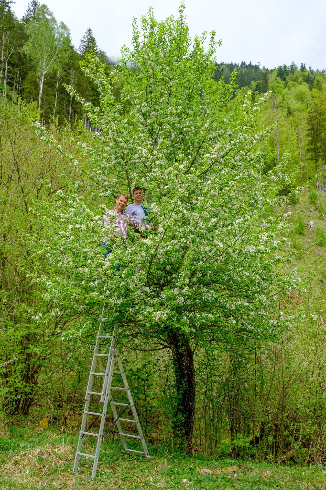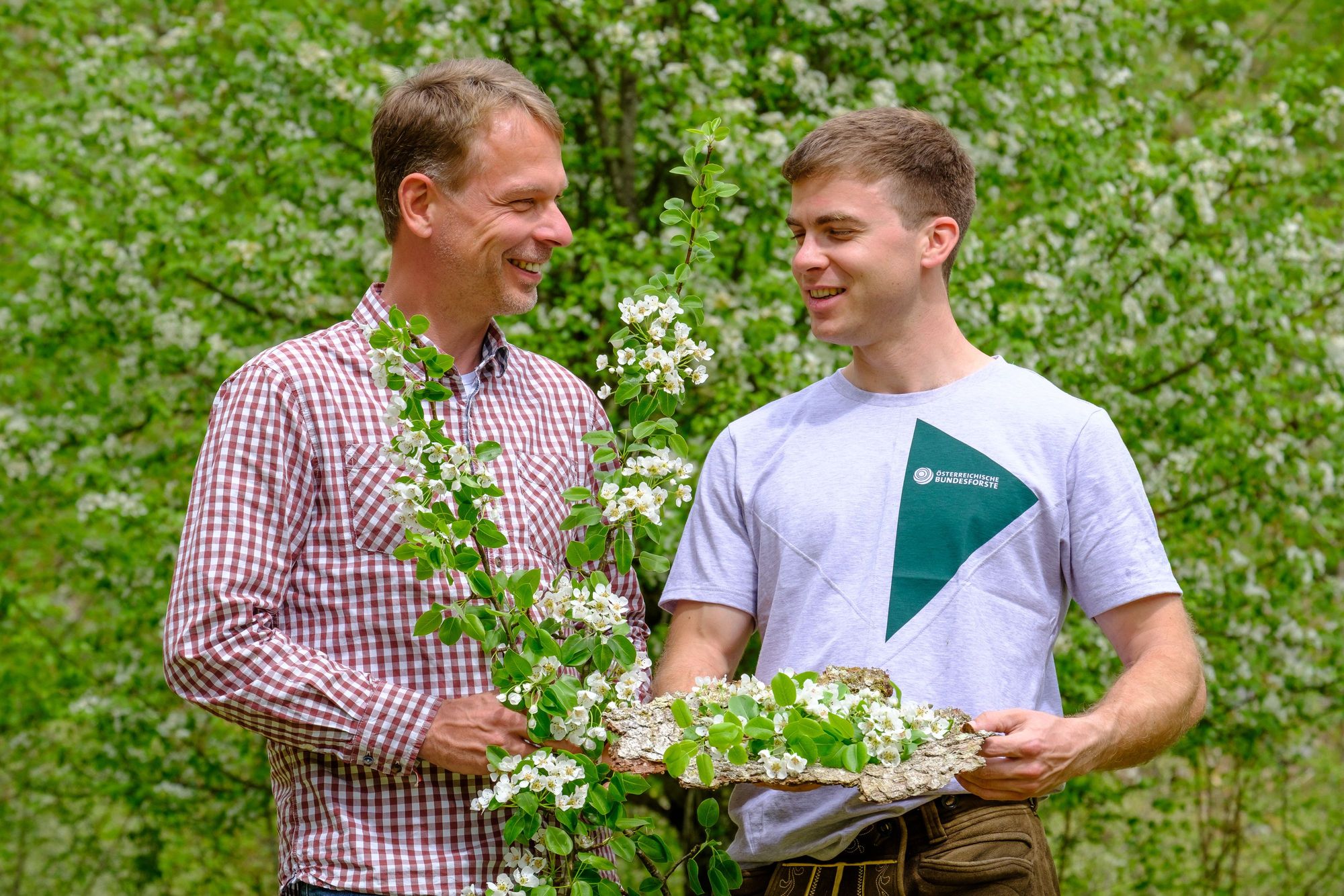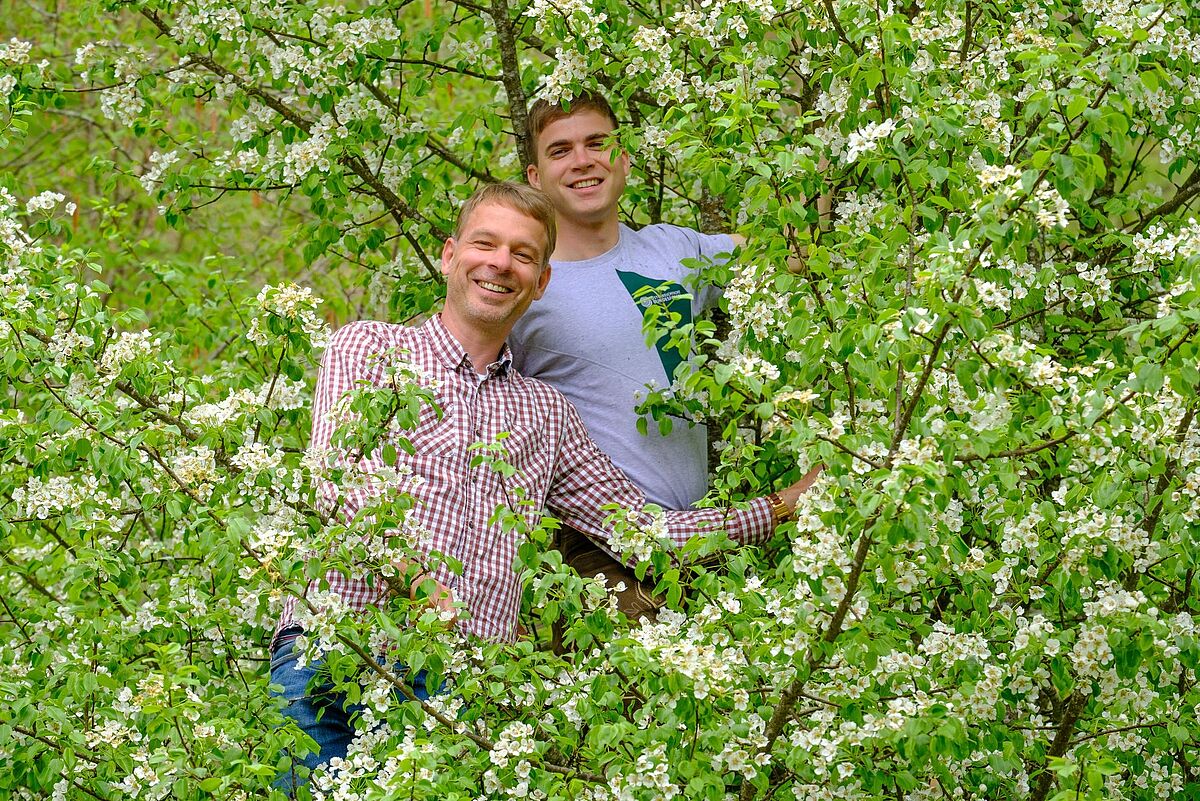 Braumeister Axel Kiesbye (li.) und Revierleiter Bernhard Jagersberger (re.) bei der Ernte der Zutaten von der Holzbirne