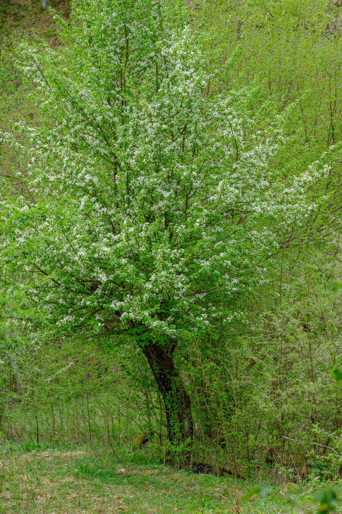 In voller Blüte stehende Holzbirne (Pyrus pyraster) auf einer Streuobstwiese im Forstrevier Wildalpen (Stmk)