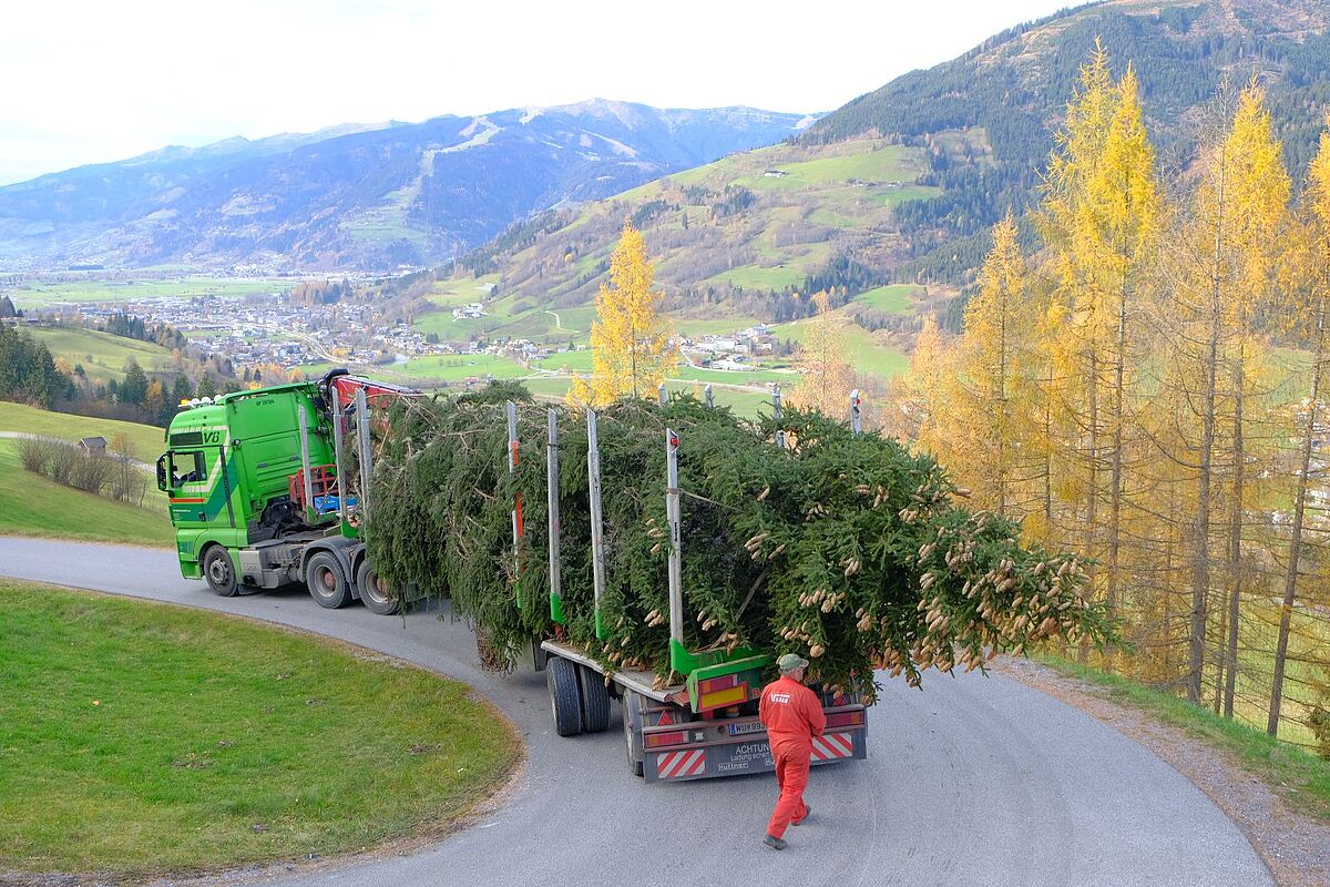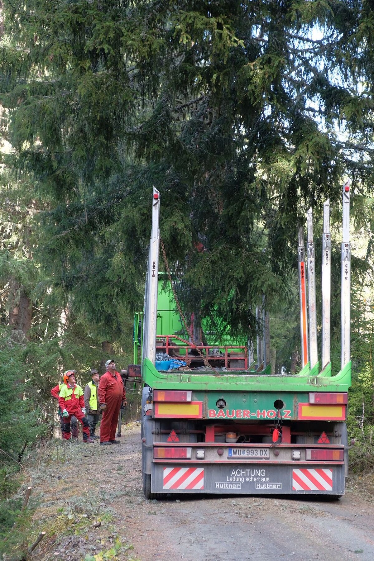 Der Christbaum aus dem Forstrevier Bruck auf dem Weg zum Weihnachtsmarkt vor Schloss Schönbrunn