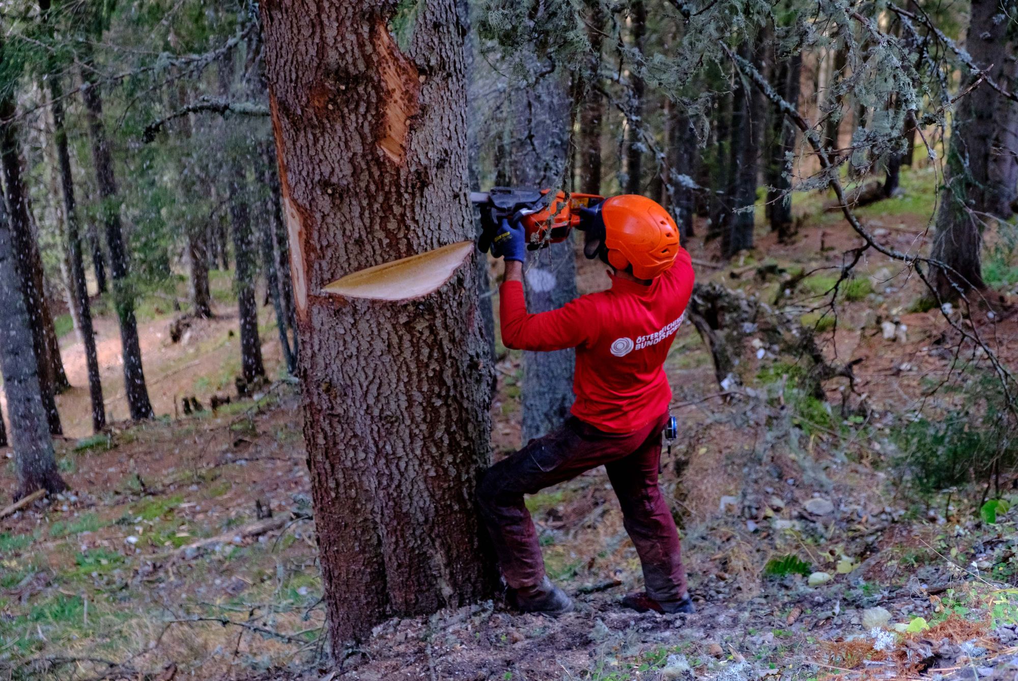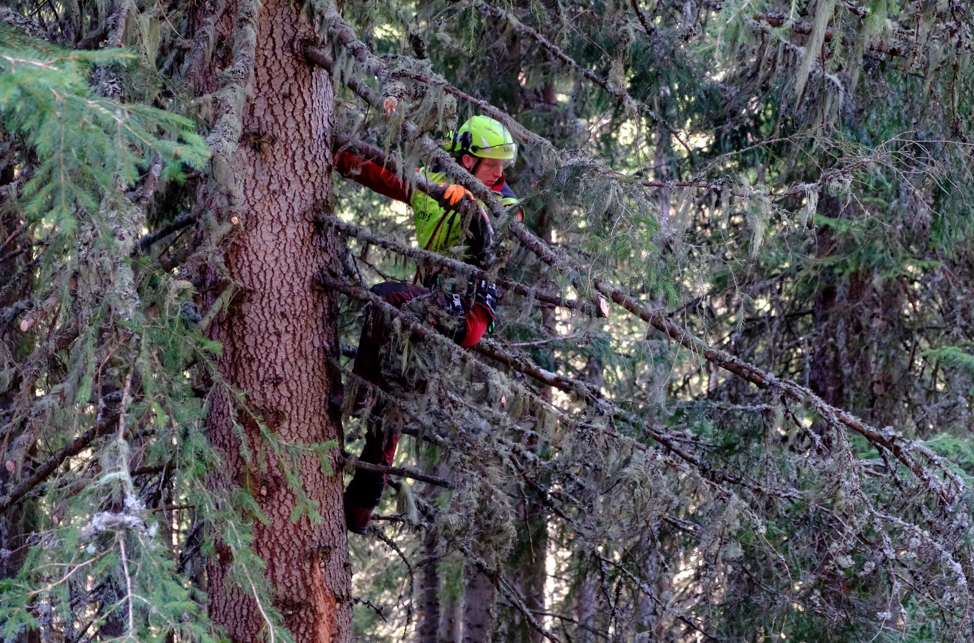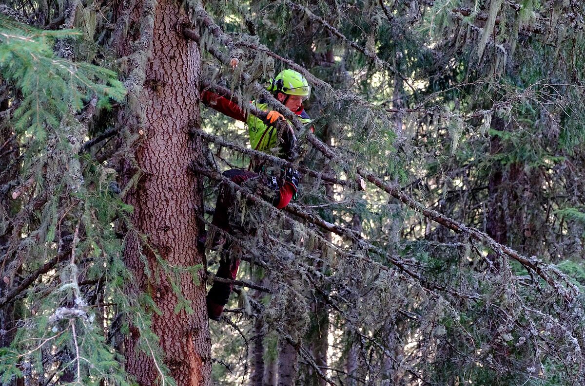 Forstfacharbeiter beim Befestigen des Seiles am Baum