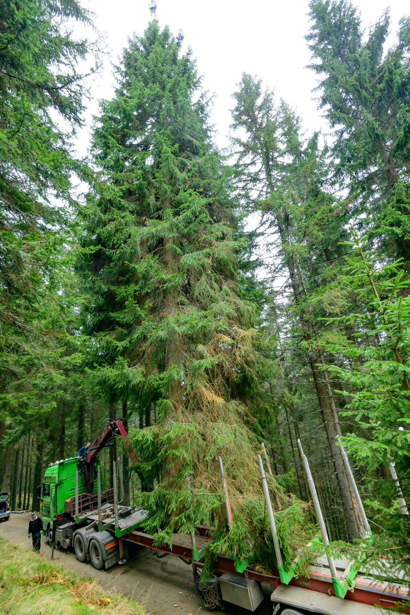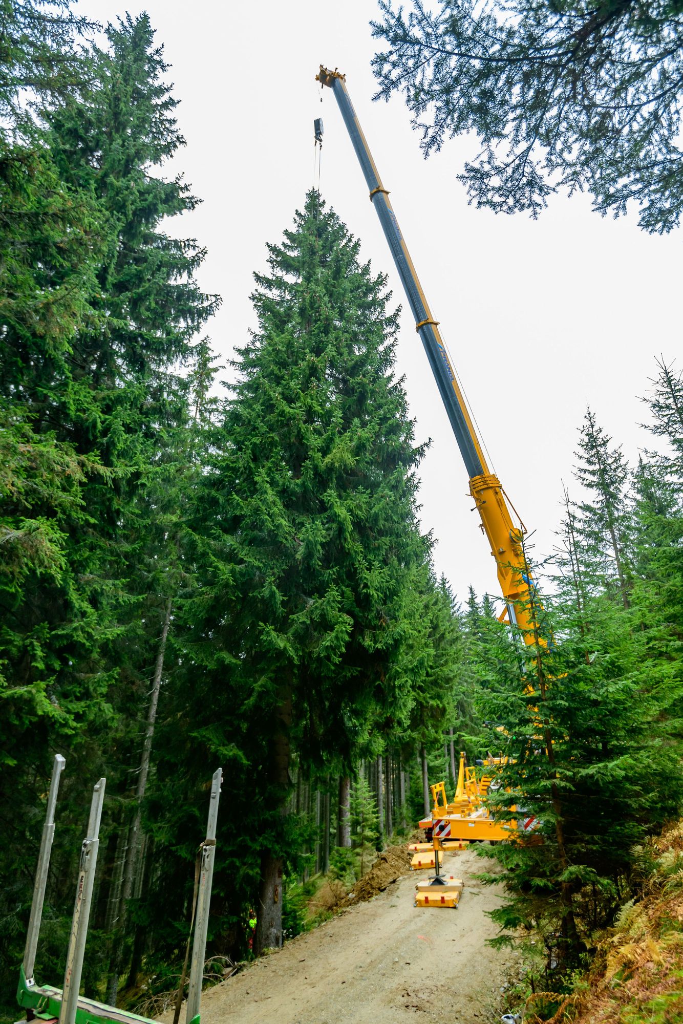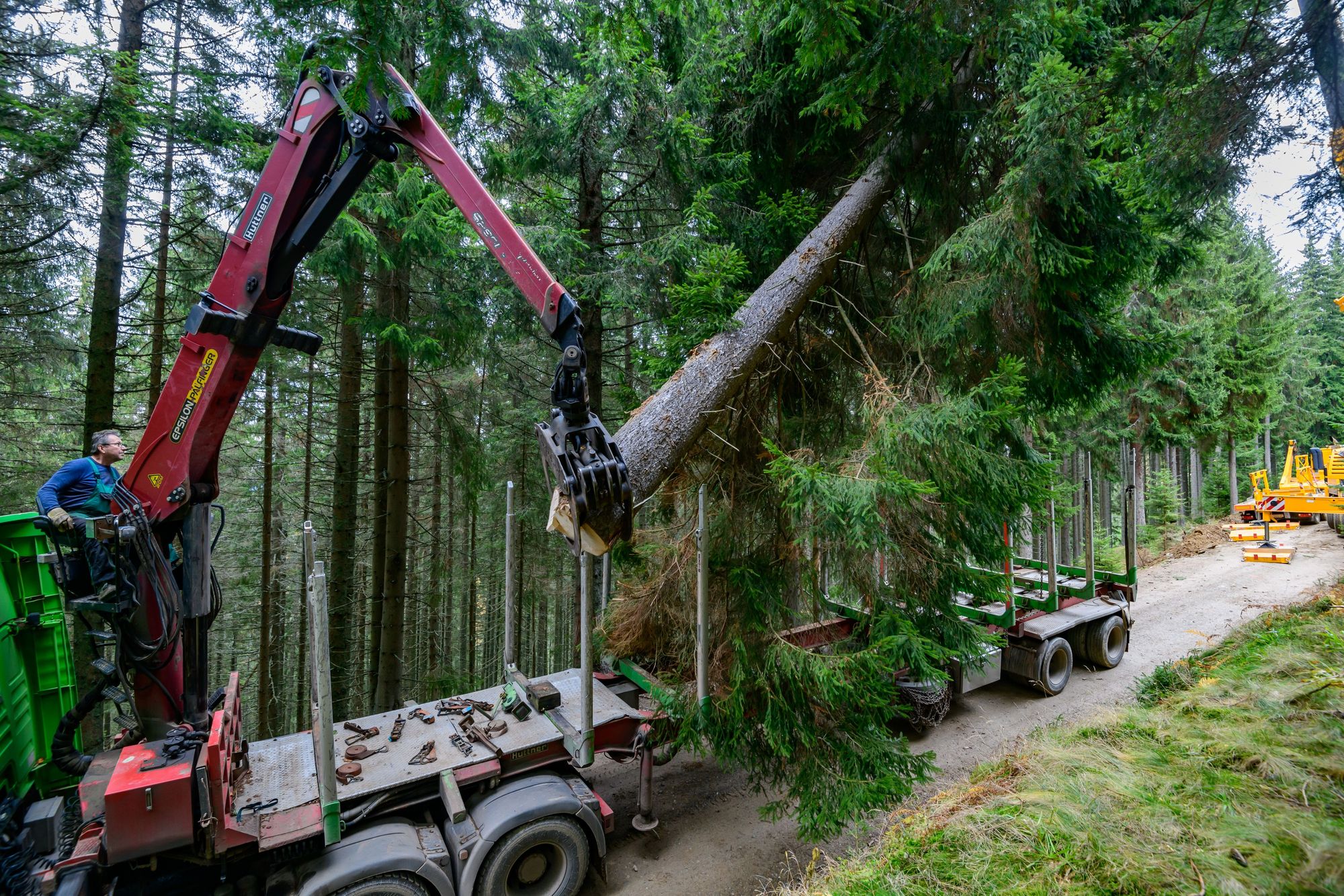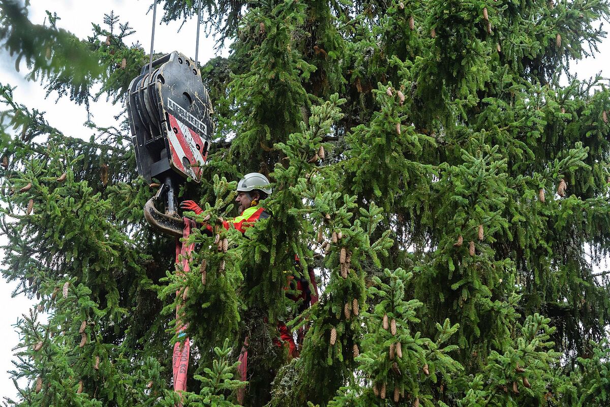 Seilkran hebt die 118-jährige Bergfichte vom Stock nach oben