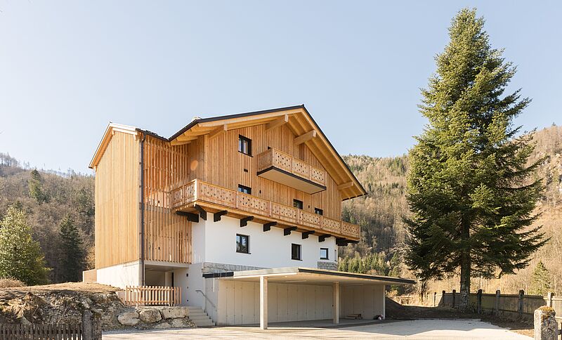 Im Zuge der Neugestaltung wurde das Gebäude von Grund auf neu strukturiert: Durch die Errichtung eines außenliegenden Stiegenhauses entstanden aus dem vormaligen Einfamilienhaus drei eigenständige Wohneinheiten mit jeweils rund 80 Quadratmetern Wohnfläche. Bei der Fassadengestaltung wurde bewusst darauf geachtet, den ursprünglichen Charakter des Forsthauses zu erhalten und dem Gebäude gleichzeitig ein modernes Erscheinungsbild zu geben. „Unser Ziel war es, die vorhandene Bausubstanz bestmöglich zu nutzen und das Gebäude langfristig und sinnvoll weiterzuentwickeln. Darum haben wir den Bestand bewusst nachverdichtet und somit zusätzlichen, attraktiven Wohnraum geschaffen“, sagt Claudia Nutz, ÖBf-Bereichsleiterin Immobilien-Tourismus-Wasser. Die großzügig geschnittenen, hellen Wohnungen verfügen über eine hochwertige Innenausstattung mit Einbauküche, Eichenmassivparkett sowie Lärchenholz-Balkone bzw. eine Terrasse. Ein großer Gartenbereich, der im Lauf des Frühlings ausgestaltet wird, steht den Bewohner*innen zur gemeinschaftlichen Nutzung zur Verfügung. Der geräumige Carport erhält eine naturnah gestaltete Dachbegrünung aus heimischen Gräsern und Moosen. Das Gebäude liegt ruhig am Ortsrand von Scharfling und ist von der Natur- und Bergwelt der Region umgeben.