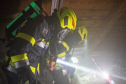 Mehrere Atemschutztrupps drangen auf den rund 1.600 Quadratmeter großen Dachboden vor, um die Ursache der Rauchentwicklung zu erkunden – ein sehr kräftezehrender und anspruchsvoller Atemschutzeinsatz für die Freiwilligen. Gleichzeitig wurde mithilfe einer Drehleiter der Löschangriff von außen gestartet.