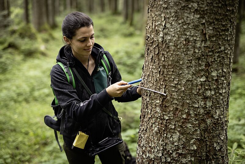 Forsteinrichterin beim Auszeigen der Bäume, (c) ÖBf-Archiv/Bazzoka Creative