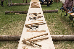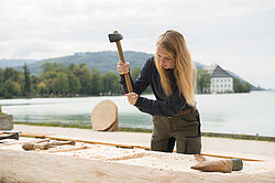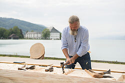 Die Arbeit an den beiden Stämmen dauert insgesamt etwa zwei Wochen. Dafür treffen an der Seewalchner Seepromenade Forschung, Praxis und Geschichte aufeinander: Einer der beiden Stämme wird zum überwiegenden Teil mit rekonstruierten Steinzeit-Werkzeugen aus Holz, Stein, Eisen oder Bronze bearbeitet, beim anderen setzen die Handwerker des Vereins Pfahlbau am Attersee und die Seewalchner Bauernschaft hingegen verstärkt auf die Motorsäge. „Insgesamt rund 600 Stunden Handarbeit stecken in einem Einbaum – vom Abflachen des Rumpfes bis zum Aushöhlen des Stammes. Uns geht es darum, diesen ursprünglichen Charakter wieder lebendig zu machen und für alle sichtbar und nachvollziehbar zu machen“, erläutert Gerald Egger vom Pfahlbauverein Attersee.