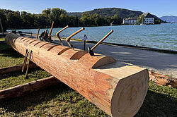 Nach der Erstbearbeitung werden die Einbaum-Rohlinge, die sogenannten „Prügel“, für mehrere Monate im Attersee versenkt. Durch die Wasserung kommt das Holz zur Ruhe und wird widerstandsfähiger gegen Sonne, Wind und Regen. Im Sommer 2026 sollen die Einbäume schließlich ihren finalen Schliff erhalten. Ihren nächsten großen Auftritt werden sie im Rahmen einer Einbaum-Regatta haben, die wie schon 2016 zahlreiche Besucher*innen an den Attersee locken soll.