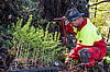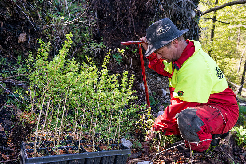 Sorgsam pflanzen Forstfacharbeiter von Hand die jungen Lärchen und Fichten in Abstand von ca. zwei Metern zum bestehenden Schutzwald.