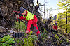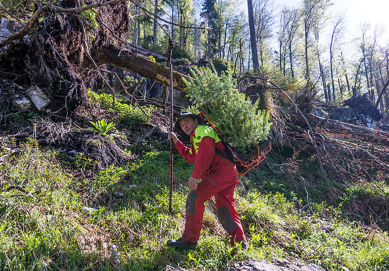 Forstfacharbeiter transportiert die Jungpflanzen in der Kraxe ins steile Gelände.