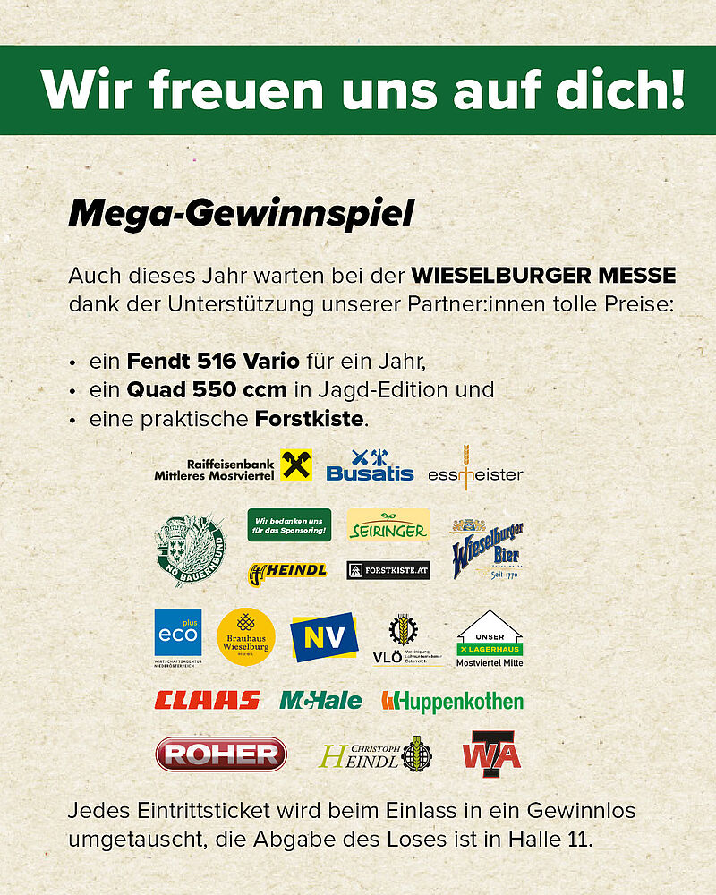 Die Wieselburger Messe, Fachmesse für Land, Forst und Jagd, fand von 22. bis 25. Mai in der Messe Wieselburg statt. 280 Aussteller*innen präsentierten ihre neuesten Produkte auf dem Gebiet der Land- und Forstwirtschaft sowie dem Jagdwesen und auch ein breites Rahmenprogramm wird geboten. Auch wir waren mit einem Infostand und unserem WILD.LIVE! Mobil vor Ort vertreten und in Halle 5 am Stand 523 zu finden - wir konnten viele Besucher*innen begrüßen, u.a. auch Norbert Totschnig, Bundesminister für Landwirtschaft, Regionen und Tourismus und ÖFB-Aufsichtsratsvorsitzender Josef Pröll!