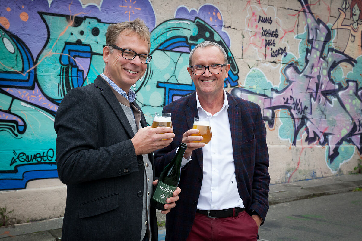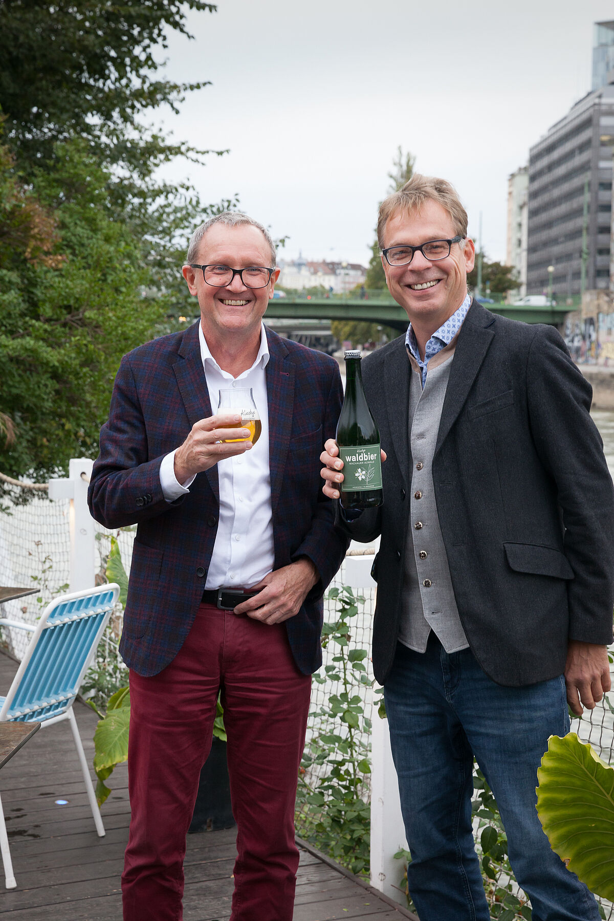 ÖBf-Vorstand Rudolf Freidhager (re.) und Braumeister Axel Kiesbye (li.) präsentieren das Waldbier Jahrgang 2022 Edition "Wachauer Auwald - Echtes Mädesüß & Silberweide" in Wien