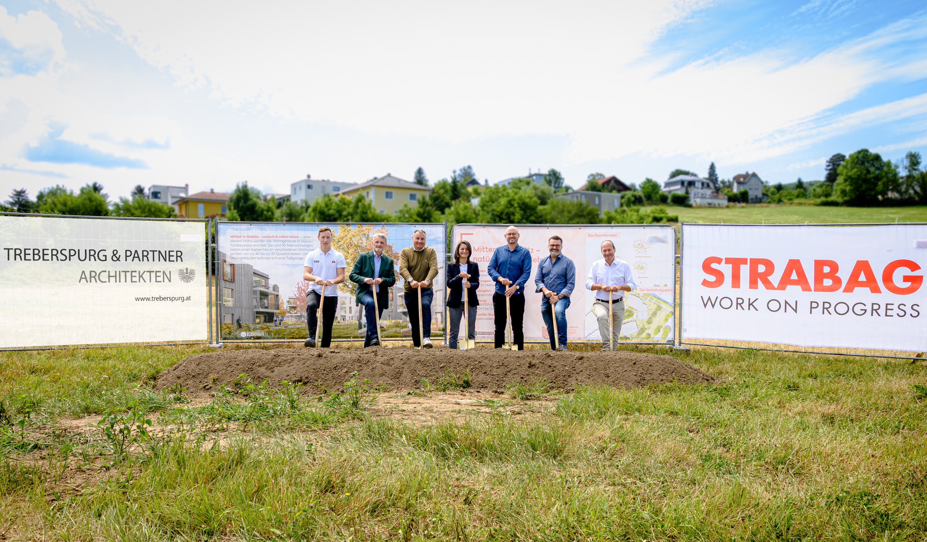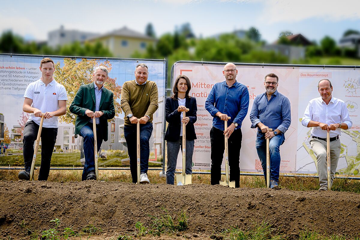 v.l.n.r. P. Gruber (Strabag), ÖBf-Vorstand G. Schöppl, Bgm. M. Cech, E. Karakütük (ABC-Bauconsulting), Ch. Treberspurg (Treberspurg & Partner Architekten), K. Petraschka (kppk ZT GmbH), G. Oitzinger (ÖBf-Betriebsleiter Wienerwald)