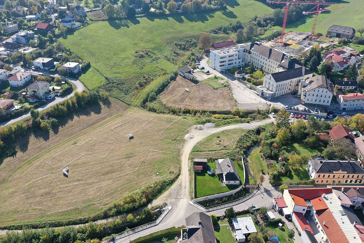 Luftaufnahme mit abgesteckten Projektumrissen vom Oktober 2022