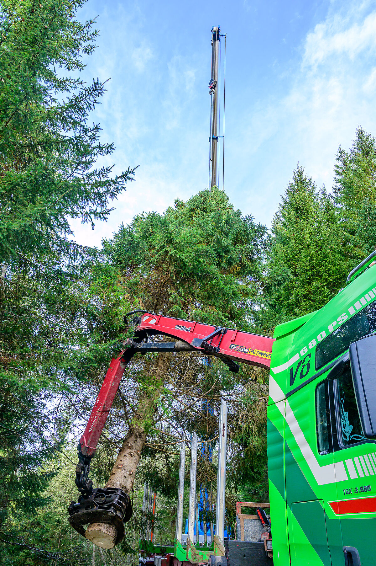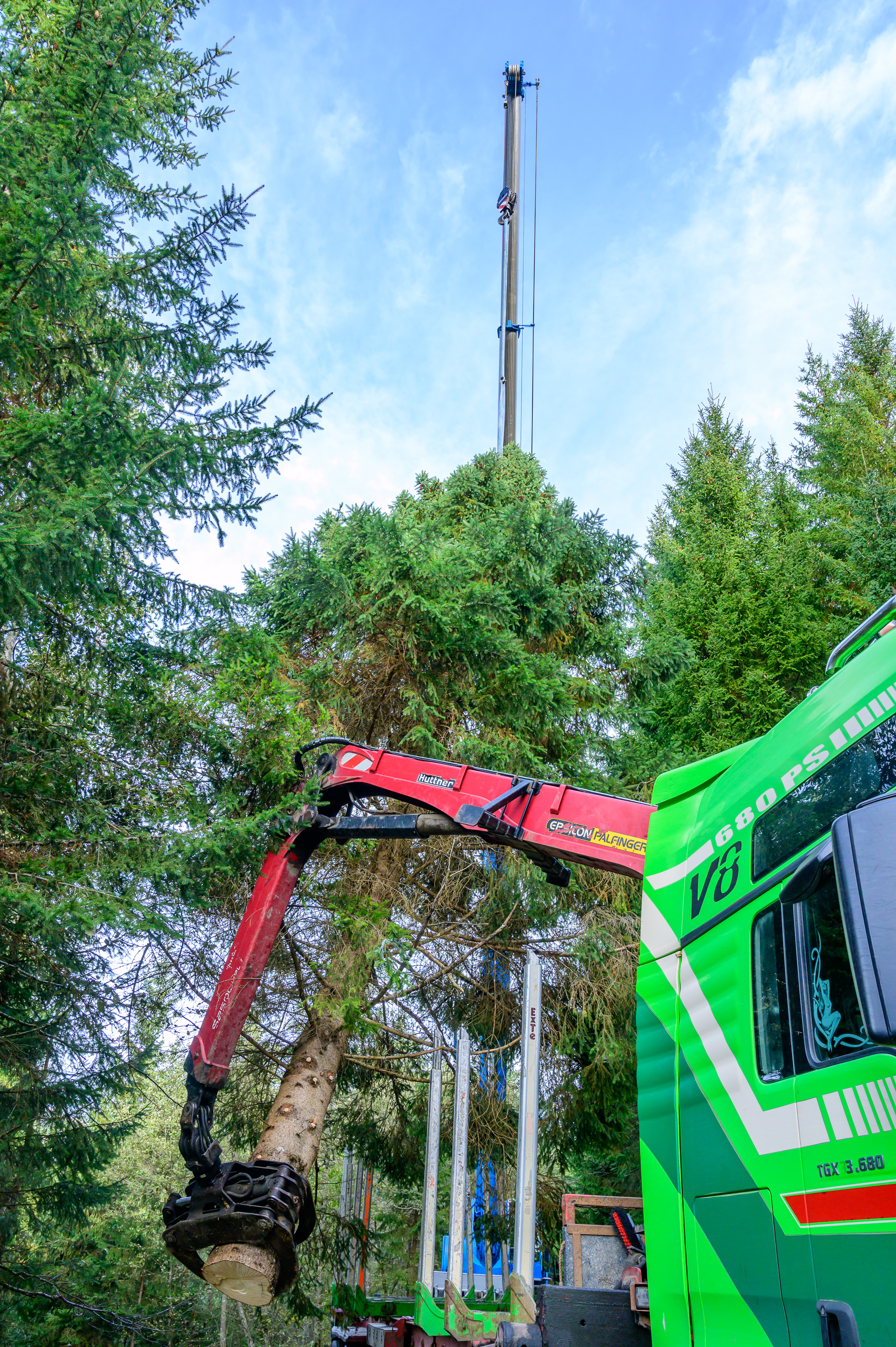 Christbaumernte mittels Seilkran und Verladen auf den Langholztransporter
